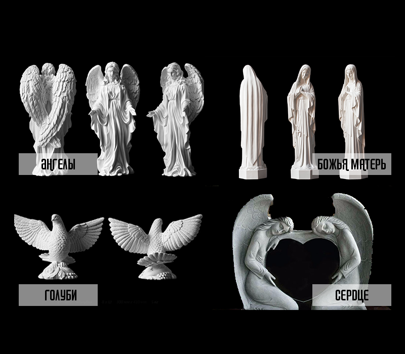 Скульптурные детали, размещённые на надгробии – это одно из самых особых типов украшения. Не считая, что они выглядят довольно красиво, выделяются на фоне черного или цветного камня, дают надгробию особые частички, они к тому же и символизируют некий скрытый смысл. Но гранитные или мраморные скульптуры вытачиваются ручным способом, и их могут позволить себе не все клиенты, потому что цена на них довольно высокая.